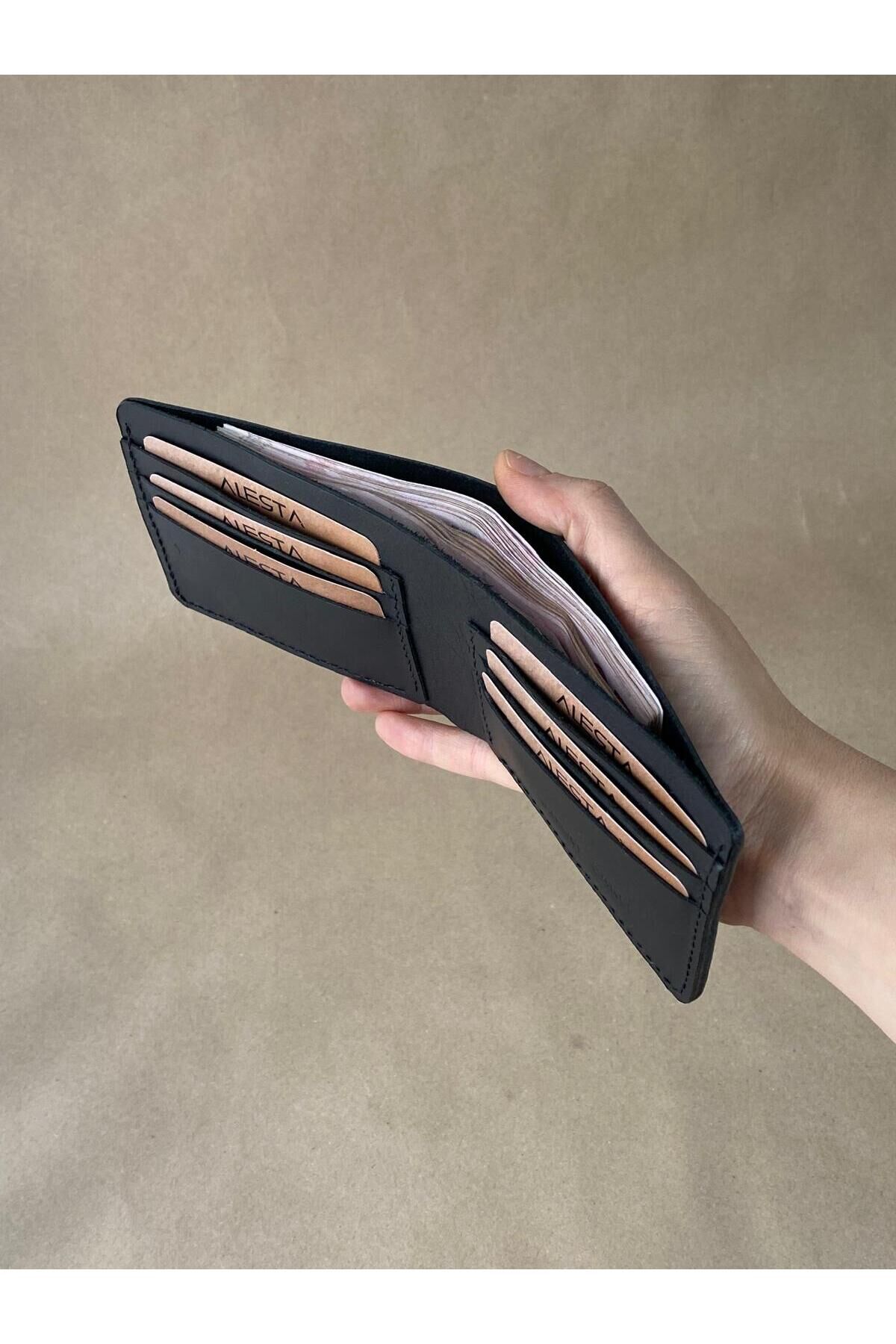 Cüzdan içinde 6 adet kart ve para bölmesi bulunur; günlük kullanımda kartlarınızı ve nakit paranızı düzenli şekilde taşımanızı sağlar.